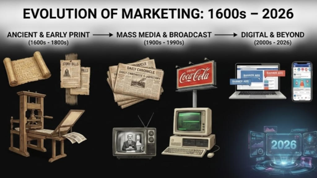 As media evolved, the system adapted without changing its core logic. Egyptian artisans used papyrus notices to extend their reach. Fifteenth-century handbills promoted specific offers following the spread of the printing press. Seventeenth-century newspapers organized listings so buyers could evaluate options side by side. Distinctive shop signs helped customers recognize merchants by symbol rather than literacy, a necessity in pre-modern retail environments.